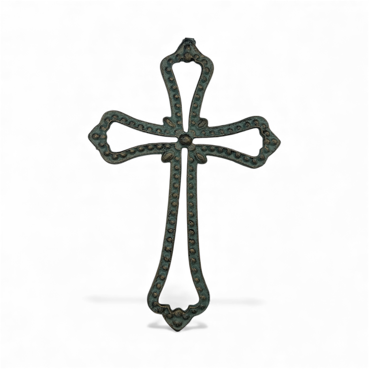 Crafted from durable cast metal, the cross is finished in a softly aged green patina that highlights the beadwork and gives it a vintage, timeworn character. Its elegant proportions make it a versatile accent—perfect for entryways, living rooms, bedrooms, prayer spaces, or outdoor covered areas.