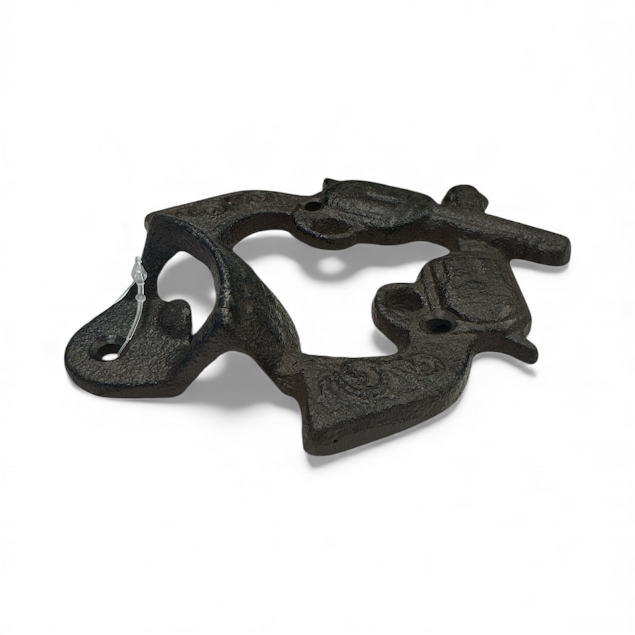 Bring bold Western character to your space with the Twin Guns Bottle Opener, a rugged wall-mounted piece that blends frontier-inspired design with everyday practicality. Featuring a pair of crossed revolvers cast in solid metal, this opener makes a strong visual statement while delivering reliable performance.