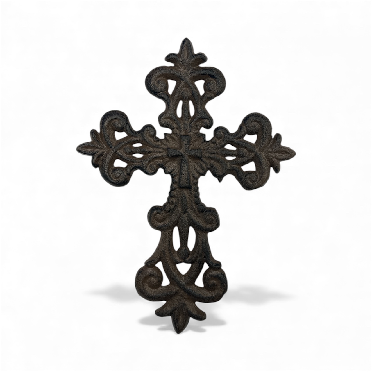 Made from solid cast iron with a dark, antique-style finish, this cross is durable and visually striking. Its layered details create depth and texture, making it a meaningful focal point for any wall.