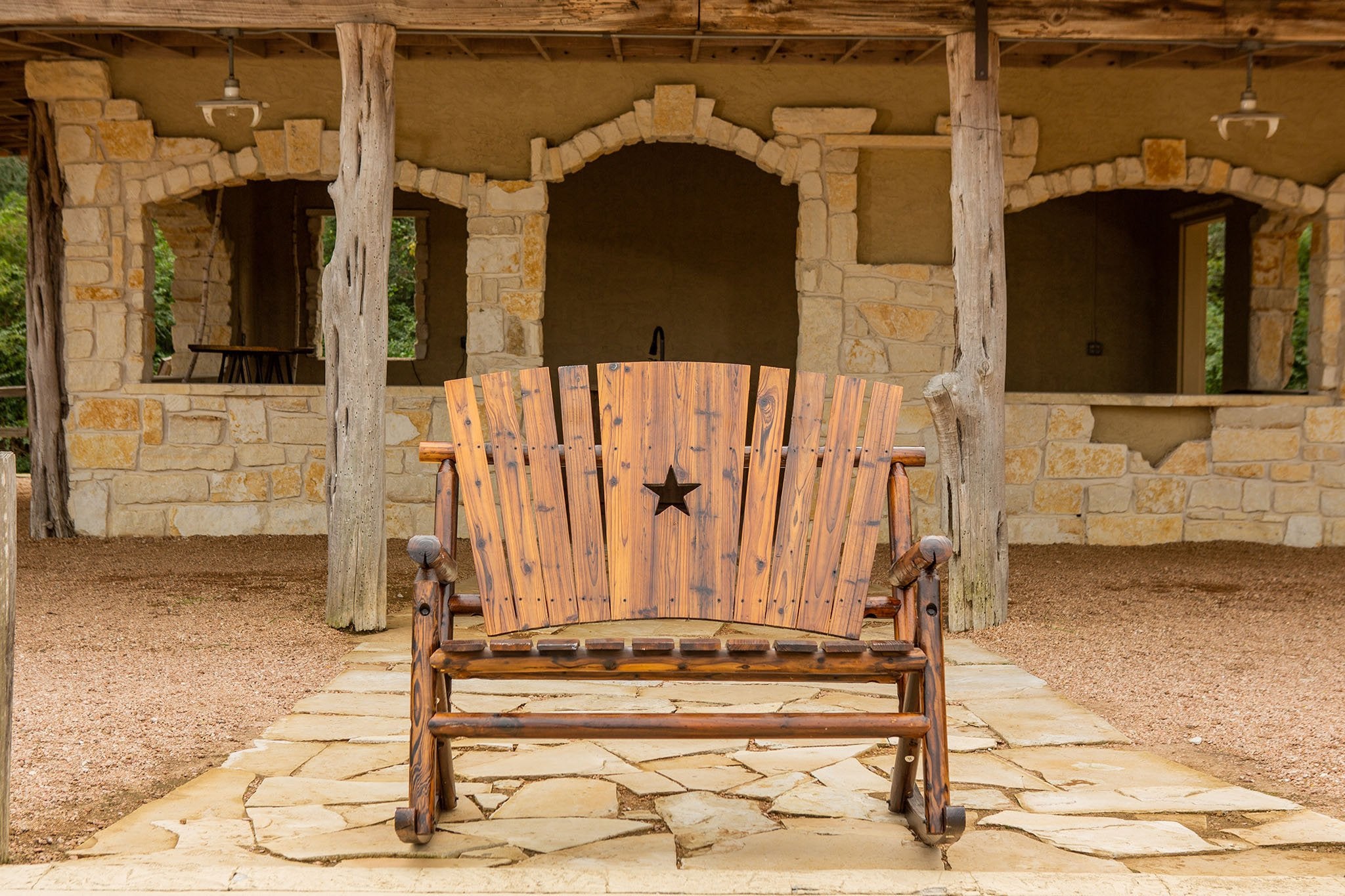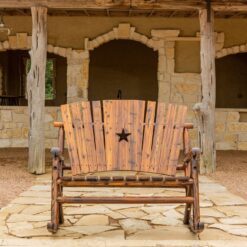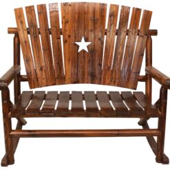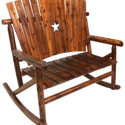 This Char-log double rocker provides seating for two with a wide, stable frame and a high rounded back. A star cut-out is centered in the back panel. Curved seat slats and rounded armrests support comfortable seating for porch or patio use.