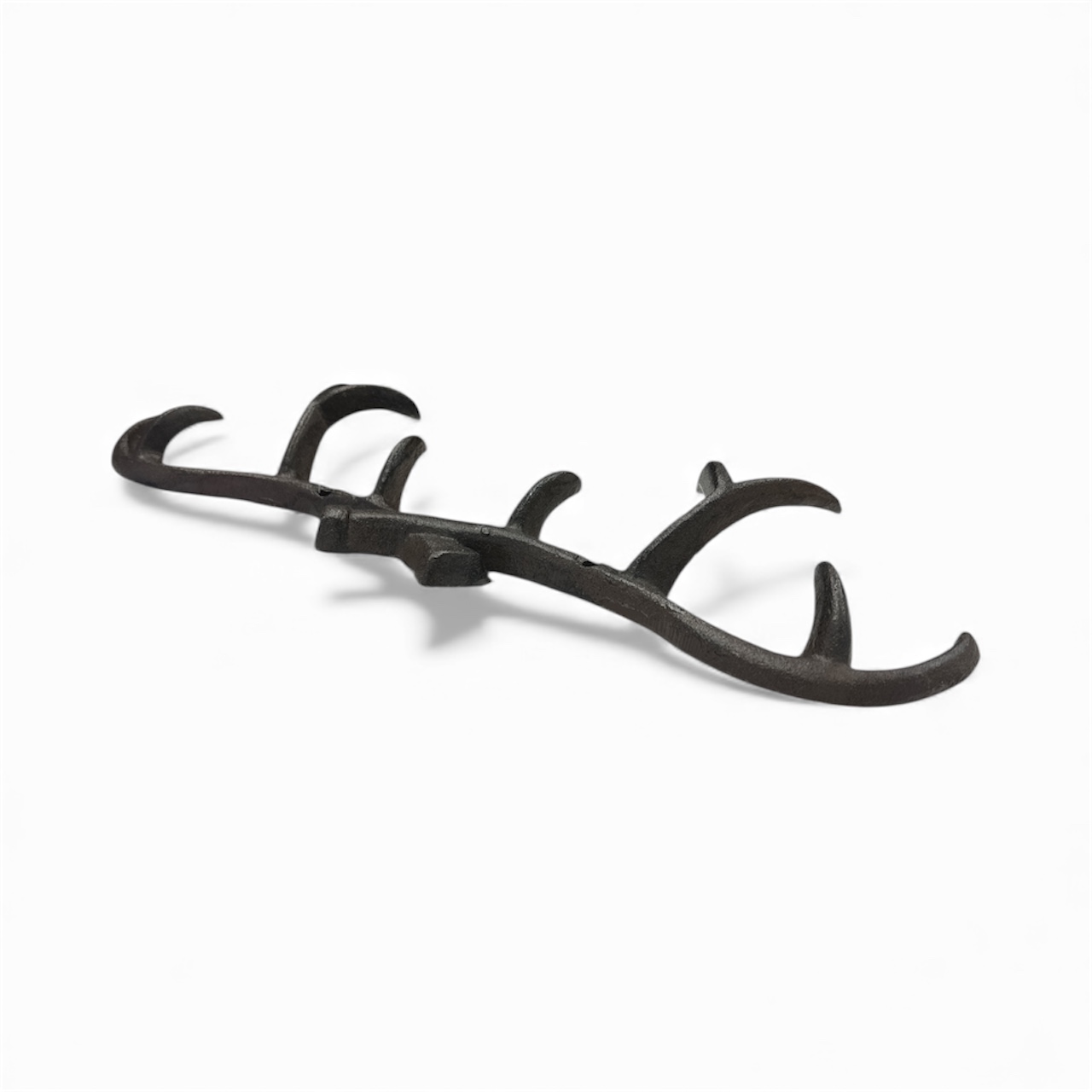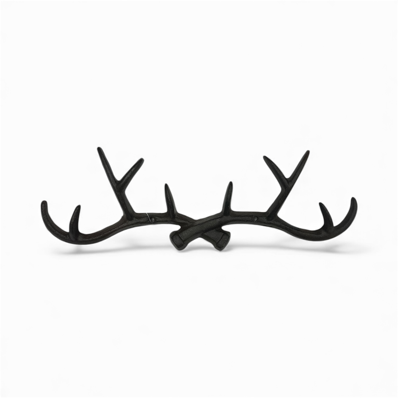 Bring rugged style and practical storage into your space with the Double Deer Antler Wall Hook, a striking piece inspired by the natural form of real antlers. Cast from solid metal and finished in a dark, rustic patina, this wall-mounted hook blends durability with distinctive lodge and Western appeal.