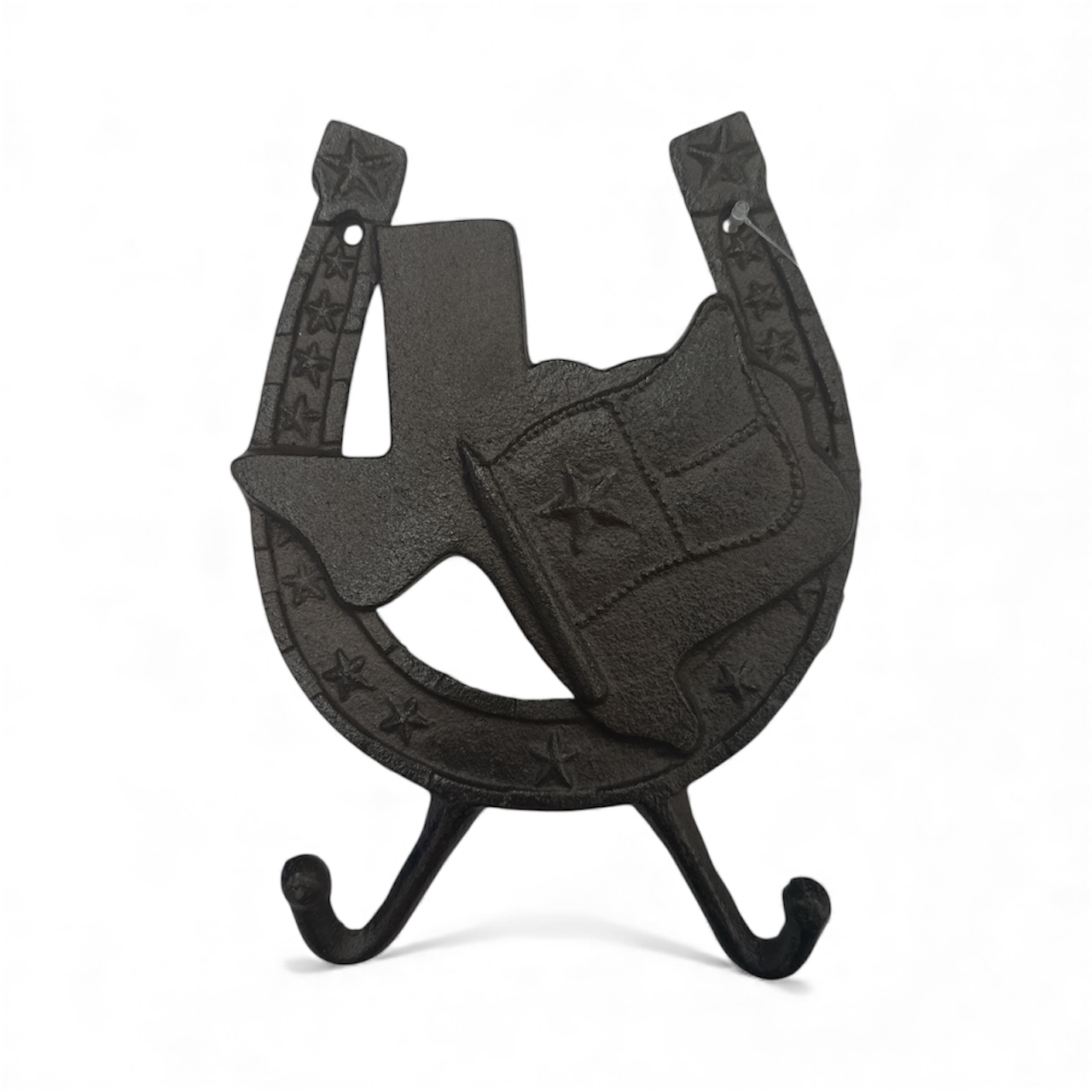 Show off your Texas spirit with the Horseshoe Double Hook – Texas Flag, a bold wall accent that blends Western heritage with everyday practicality. Crafted from solid cast metal, this piece features a classic horseshoe frame adorned with star detailing and a raised Texas flag motif, creating a strong visual tribute to the Lone Star State.
