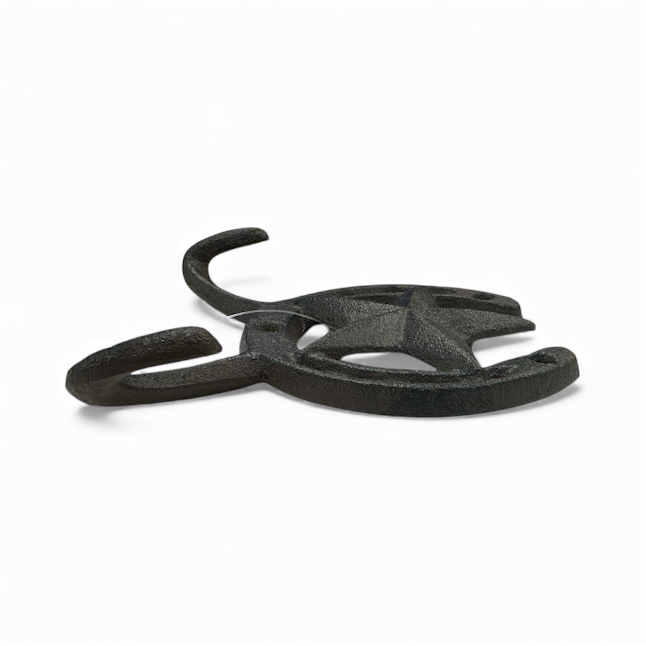 Crafted from solid cast metal, the design showcases raised star detailing surrounded by the curved horseshoe form, a combination long associated with strength, luck, and heritage. The two outward facing hooks extend from the base, providing sturdy support for coats, hats, bags, towels, leashes, or gear. A dark, rustic finish highlights the textured cast surface, giving the piece an aged appearance that feels authentic and substantial.
