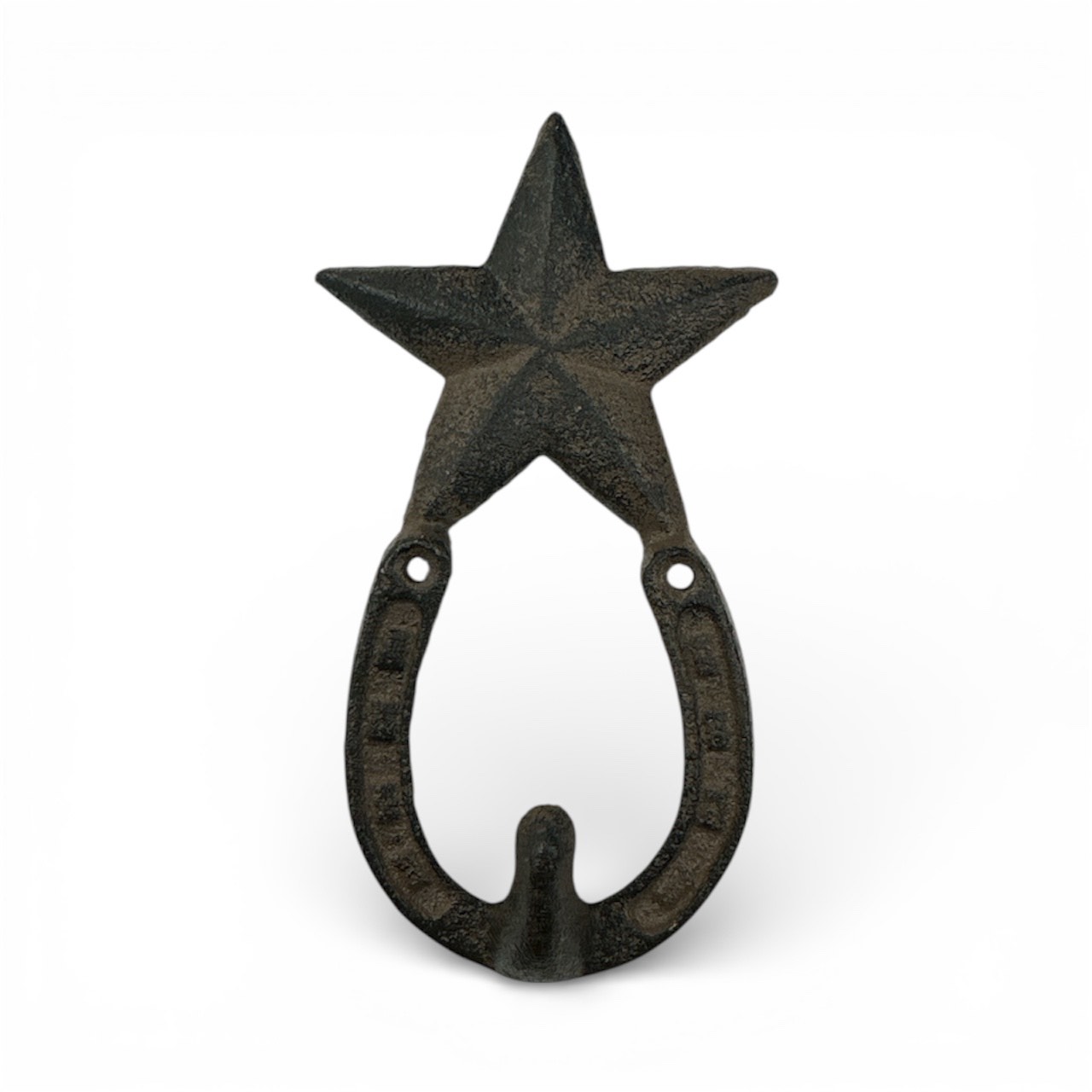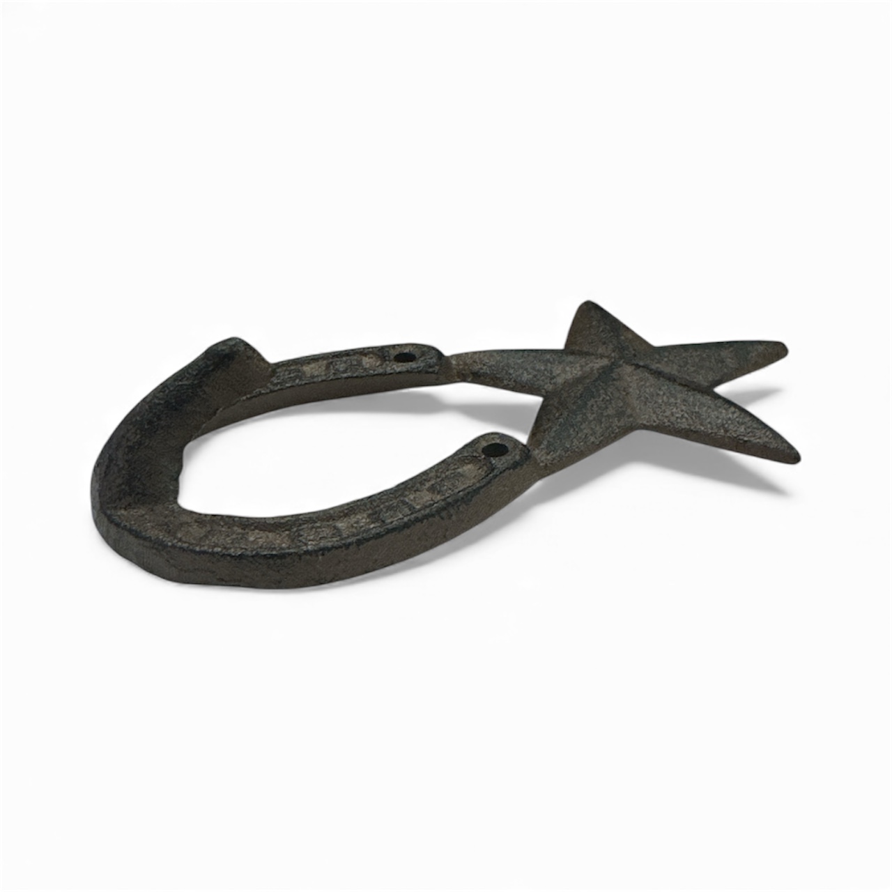 This horseshoe star wall hook combines decorative design with functional storage. A five-point star sits above a single hook formed from a horseshoe shape. The piece is suitable for hanging lightweight items such as keys, hats, or small accessories.