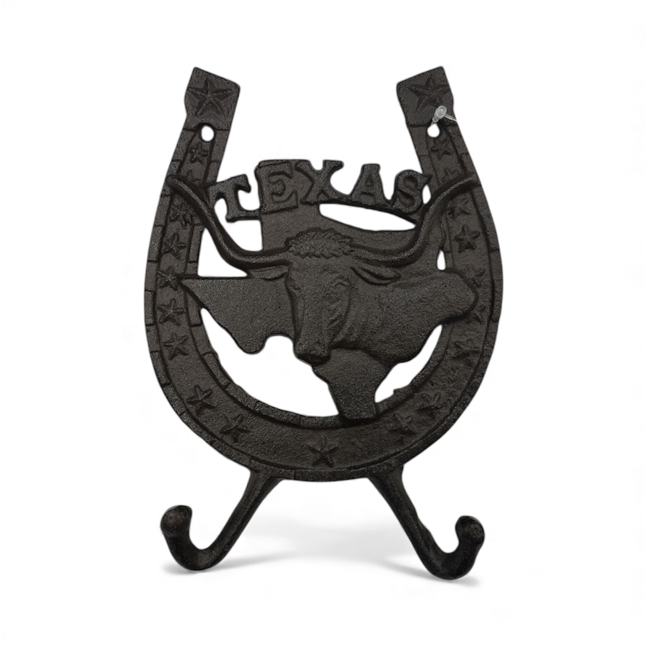 Celebrate Texas pride and Western heritage with the Horseshoe Steer Texas Wall Hook, a bold and functional accent designed to stand out. Crafted from solid cast metal, this piece features a detailed longhorn steer centered over the shape of Texas, framed by a classic horseshoe with star accents for unmistakable Lone Star character.