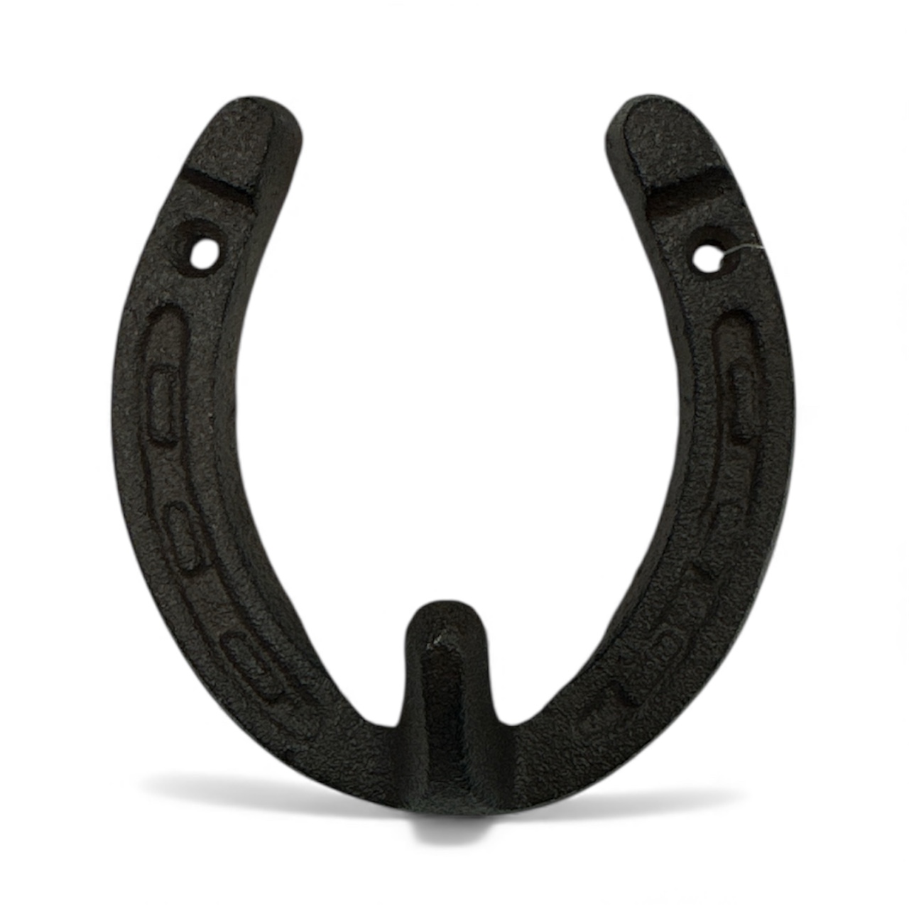 Crafted from solid cast metal, the horseshoe shape forms a sturdy single hook designed to handle coats, hats, keys, leashes, or light gear. The dark, weathered finish highlights the cast texture and recessed detailing, giving it an aged appearance that feels authentic and well worn. The upward curve helps keep items securely in place while maintaining a clean, understated profile on the wall.
