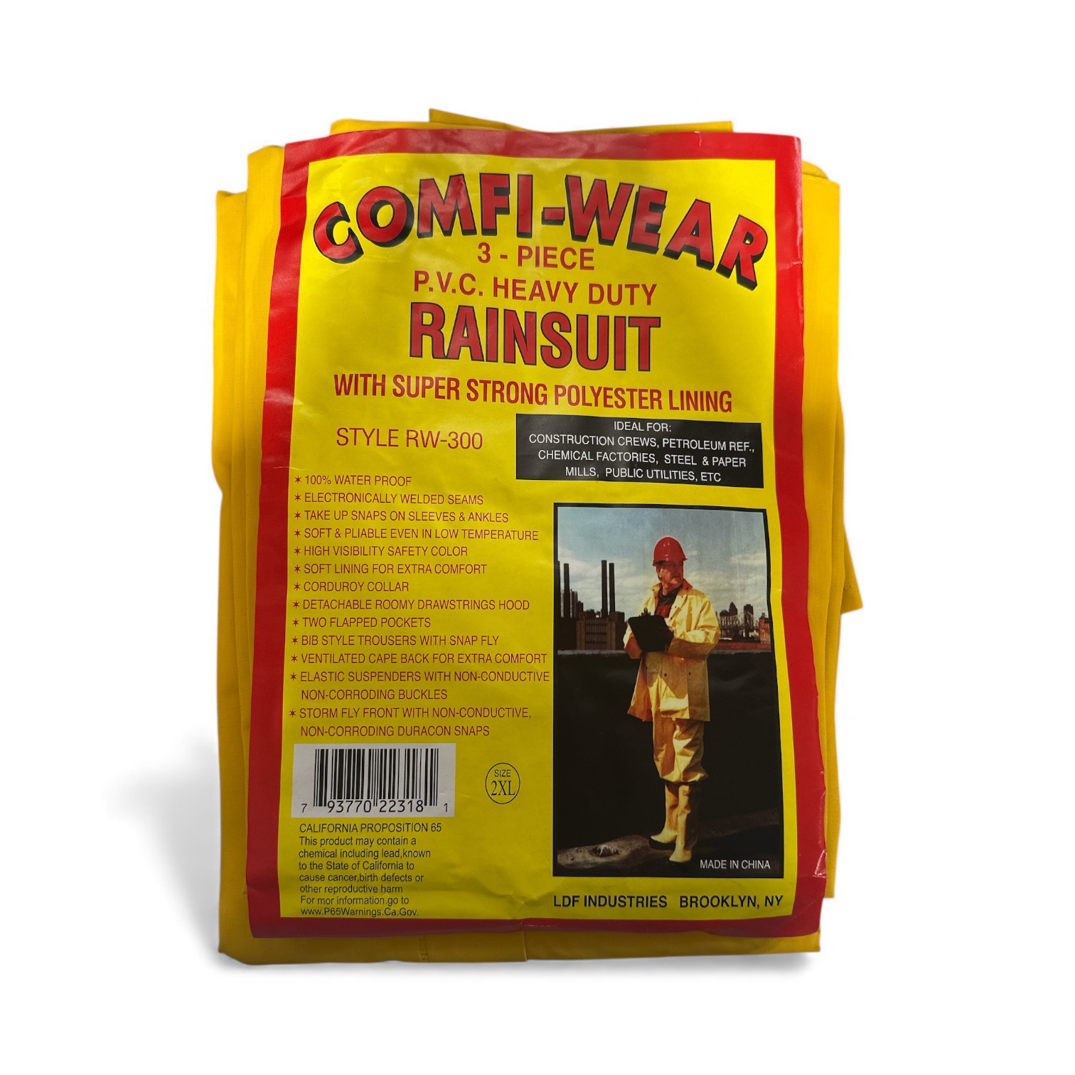 Lightweight rain suits are highly waterproof. Set includes a rain jacket, detachable hood, and bib pants offering 100% waterproof and windproof protection. Bright yellow rain coat has two large cargo pockets, vented back and underarms, zipper plus snap storm placket, and corduroy collar. Bib pants have an adjustable waist and suspenders and snap fly access.