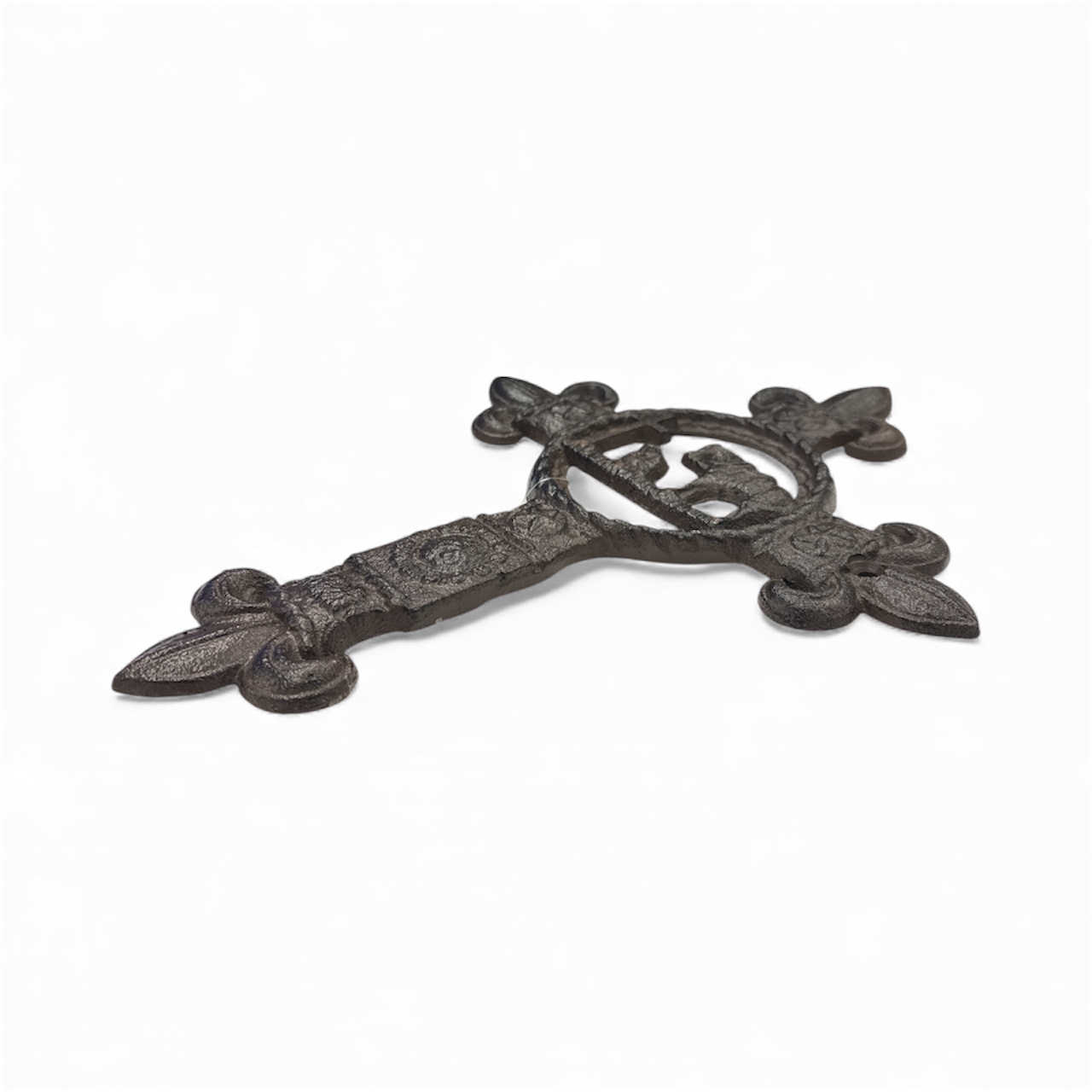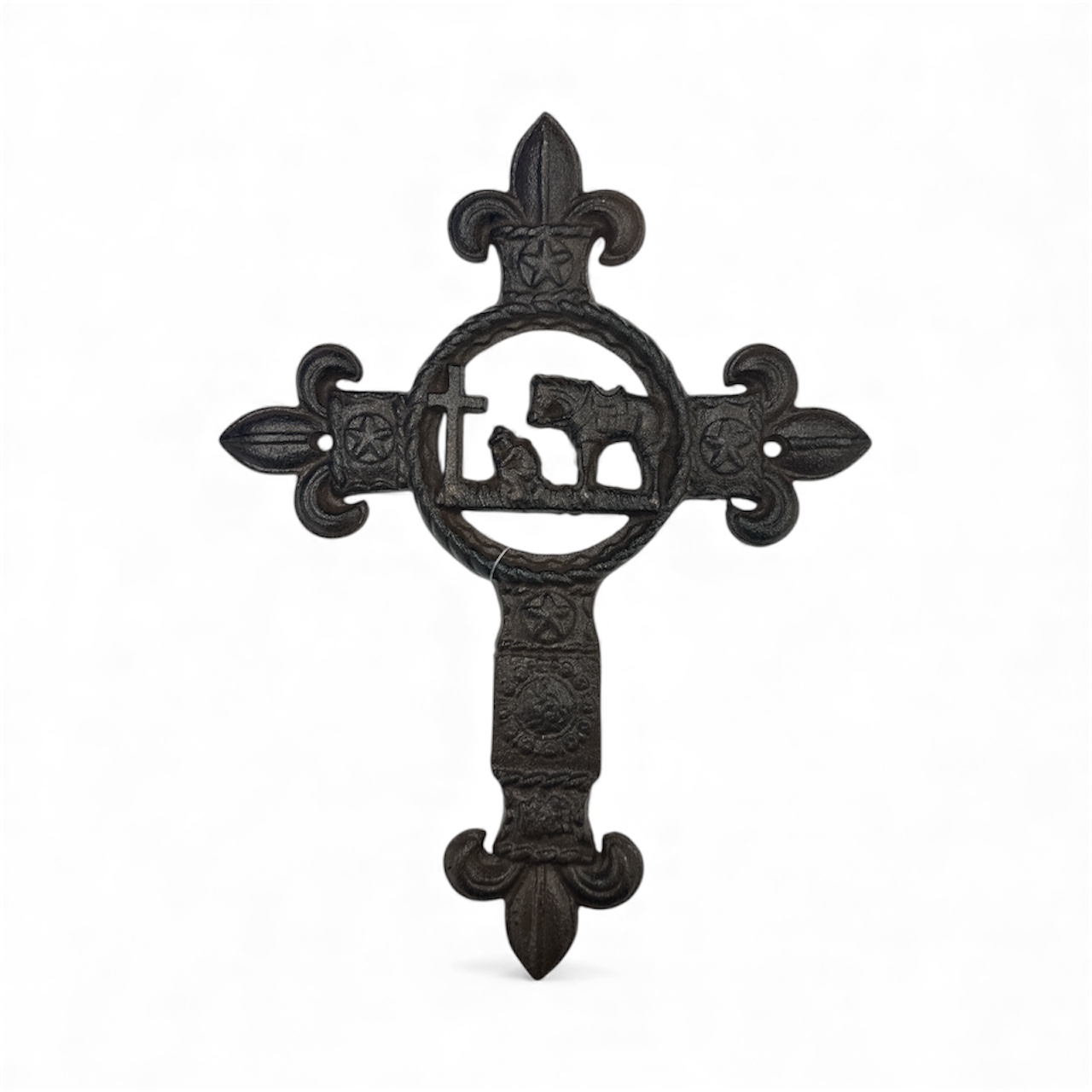 The cross itself is richly detailed, featuring fleur-de-lis inspired points and subtle star motifs that add depth and texture without overpowering the central imagery. The cast metal construction gives the piece a reassuring weight and durability, while the dark, weathered patina enhances its rustic character and old-world appeal. Each detail feels intentional, as though shaped by tradition and meant to be passed down.
