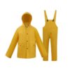 PVC 3-piece rain suits are manufactured from 100 percent non-conductive material and are highly waterproof. Set includes rain jacket, detachable hood, and bib pants made of PVC/polyester material, offering 100% waterproof and windproof protection. Bright yellow rain coat has two large cargo pockets, vented back and underarms, zipper plus snap storm placket, and corduroy collar. Bib pants have an adjustable waist and suspenders and snap fly access.