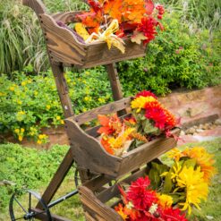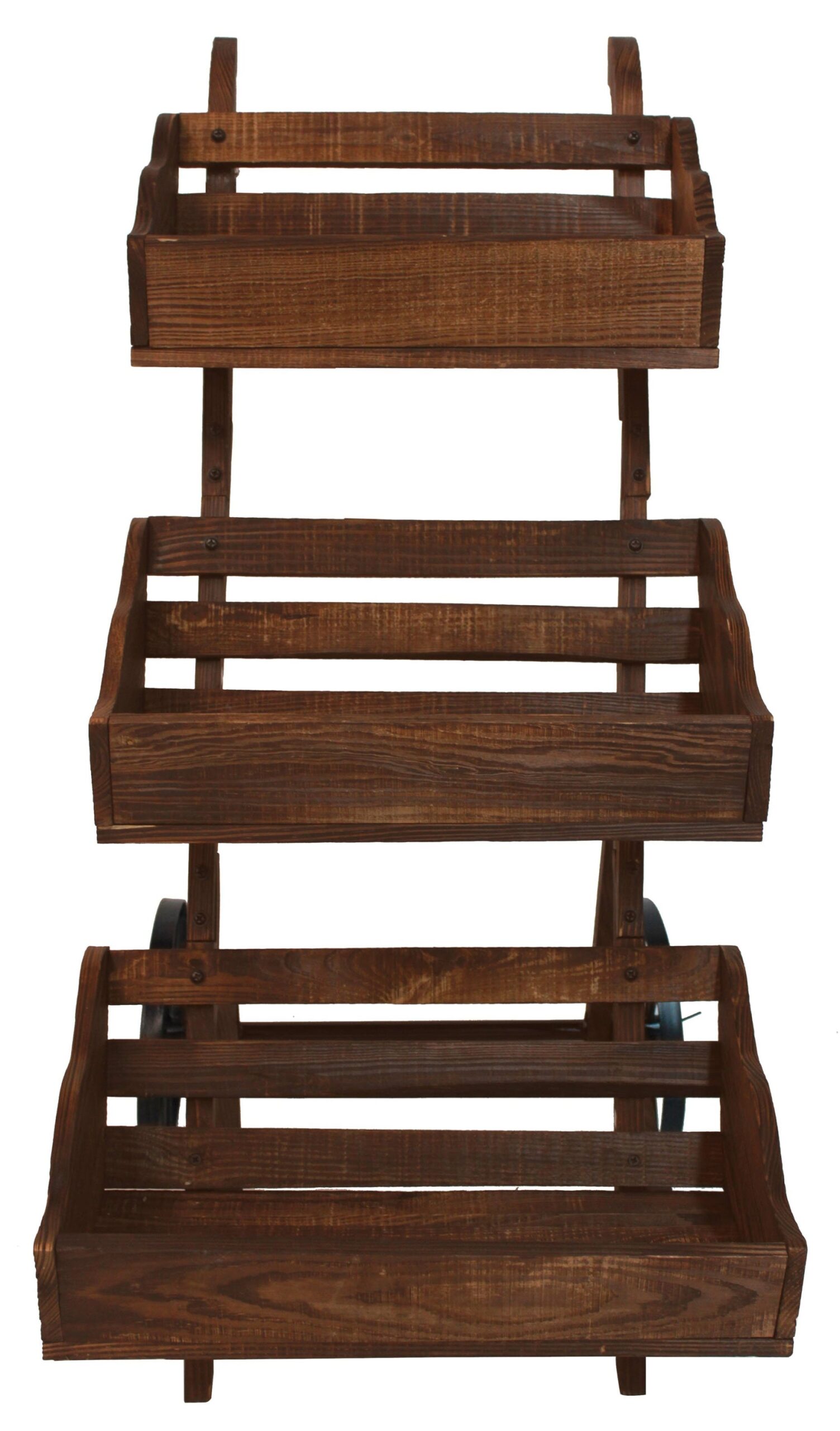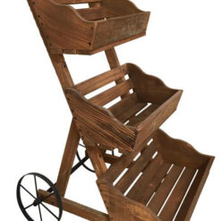 This three tier wooden wagon planter stand offers vertical storage and classic country style while taking up the footprint of a single large planter. Designed to hold pots, plants, or gardening supplies, it provides a practical solution for organizing greenery in a compact space.