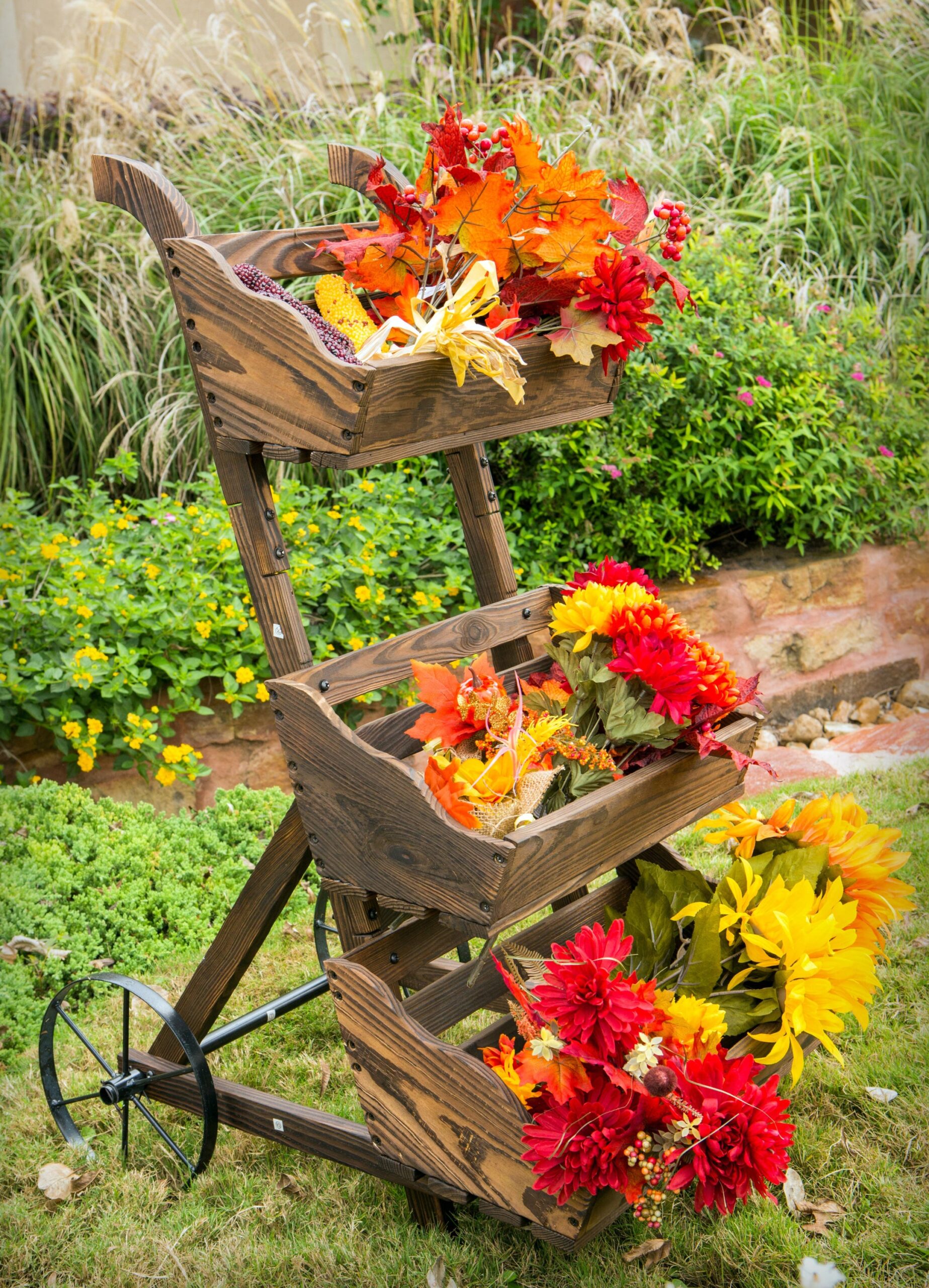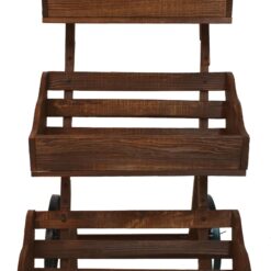 Decorative metal wheels give the planter the appearance of a small garden cart, adding visual interest and rustic appeal. The tiered layout allows for easy access to plants while creating depth and dimension in your display. Use this planter in a covered or protected area to help preserve the finish and maintain its rich color over time.