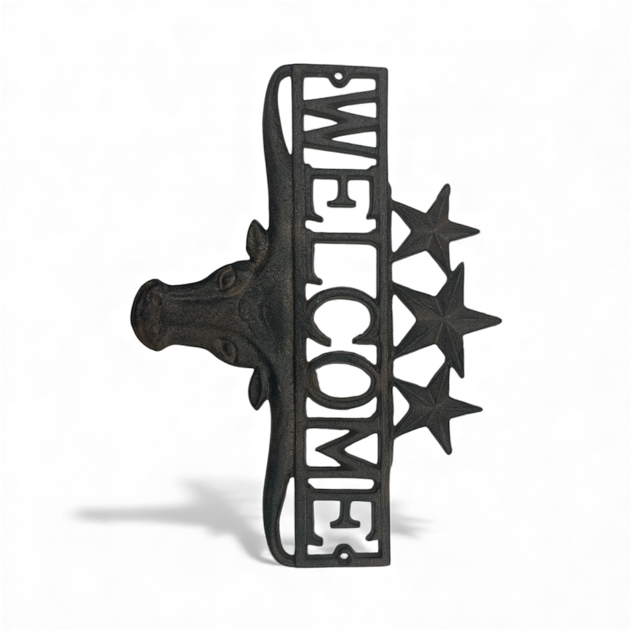 This Welcome Plaque with Steer Design delivers bold western character and warm hospitality in one striking piece. Featuring the word WELCOME topped with three stars and anchored by a detailed steer head, it captures the spirit of ranch living and classic Americana.